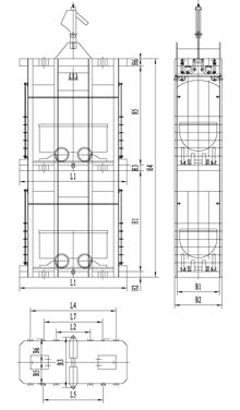 單繩罐籠由楔形連接裝置,抓捕器、罐體、罐內阻車器、導向裝置組成,如用于上下人,則必須設置斷繩保險器(防墜器),抓捕器根據制動繩布置形式可分為I型(對稱)抓捕和II型(對角)抓捕形式。常用單繩罐籠及配套防墜器的具體型號參數見附表。