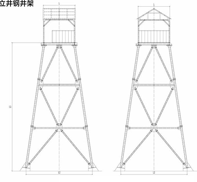 以上所列立井鑿井井架均為鋼管井架,包括五個(gè)型號(hào)共七種。本井架系列可滿足井徑3.5~8.0cm,井深200~1000m的立井井筒施工及其工藝要求,其中V型井架更適用于采用大型機(jī)械化配套設(shè)備的深井施工。